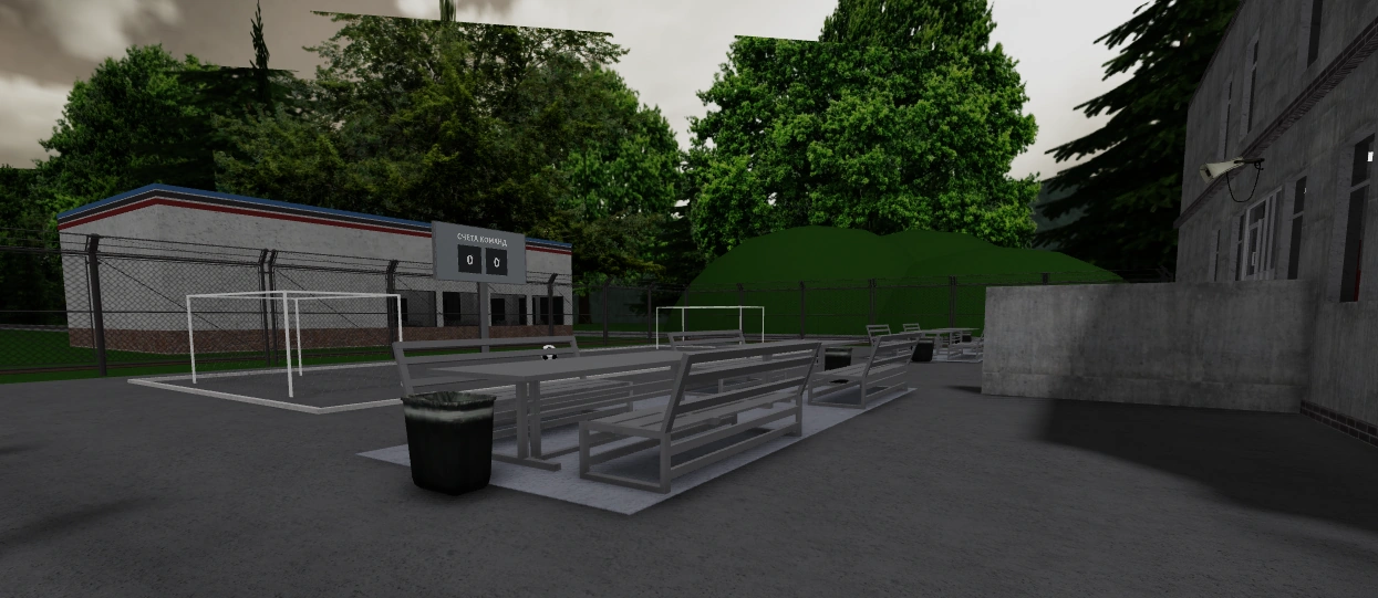 Выход во двор оформлен почти также, как и в Дурку, только без навеса. Поблизости стоит 4 стола и 8 скамей суммарно; по бокам столов расположены 4 мусорки, из которых за негосударственную роль можно вытащить материалы для крафта - доски, метал и скотч (хотя внешне можно также увидеть банки неиспользованных в игре напитков и скомканные газеты). Кулдаун на сбор материалов ~2 минуты.